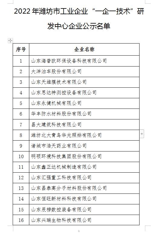 濰坊市工業(yè)和信息化局關(guān)于擬認定2022年濰坊市工業(yè)企業(yè)“一企一技術(shù)”研發(fā)中心的公示于2022年9月27日正式確定,山東沃華科技成功入選。